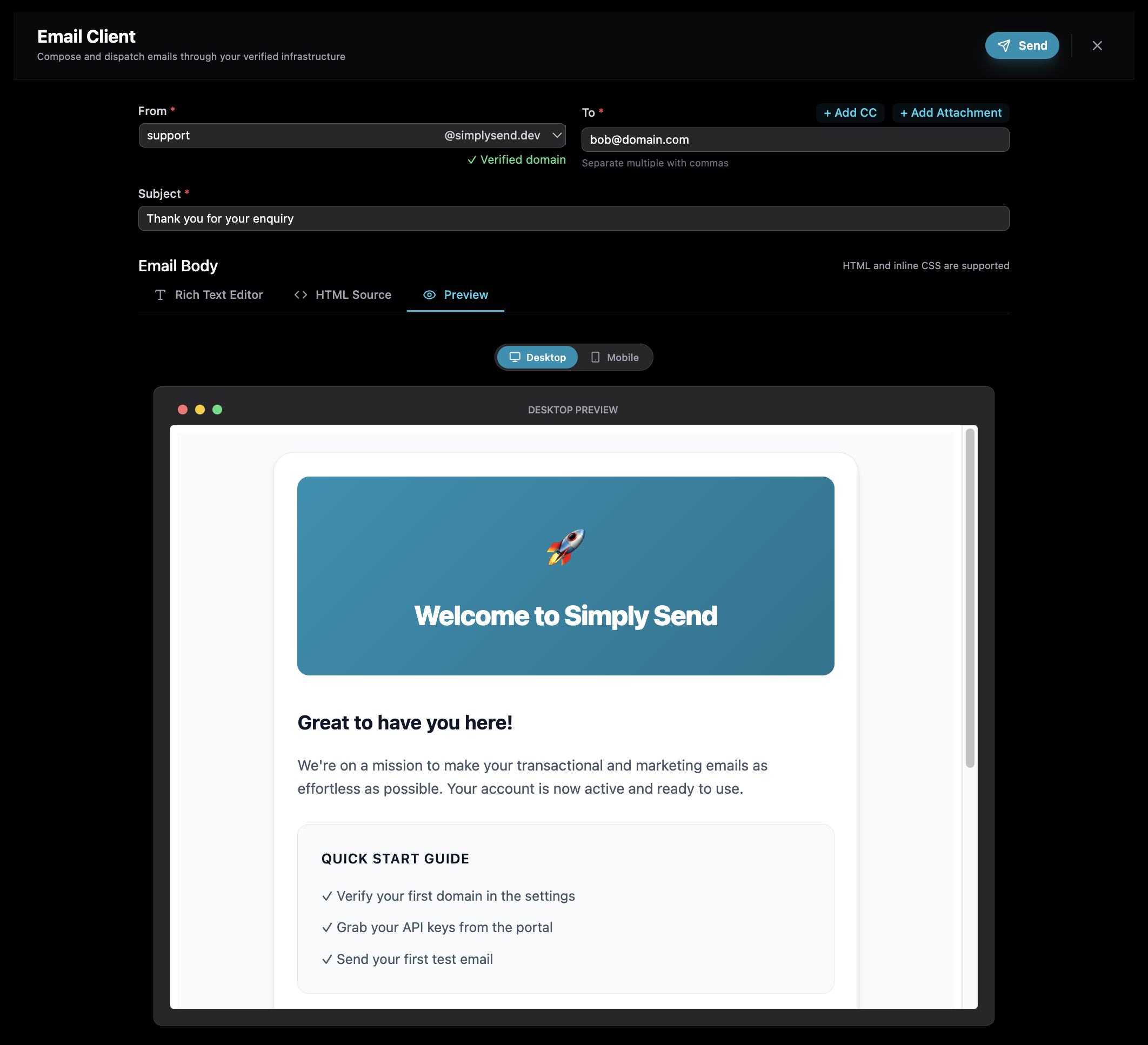We believe you shouldn't be gated by infrastructure costs when testing a new market or domain. The Email Client provides a direct window into your delivery engine.